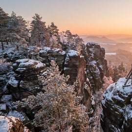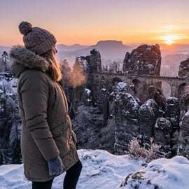 Experimenta la magia del invierno en esta espectacular región. Admira la belleza de las torres de arenisca cubiertas de nieve, pasea por el Puente Bastei y llega hasta las ruinas medievales del Castillo de Neurathen.