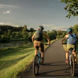 Evitarás los coches al comenzar tu viaje justo en las afueras de Praga, en la tienda Martin's Adventures, a donde llegarás desde tu hotel. Aproximadamente el 97 % del recorrido sigue carriles bici designados (en su mayoría pavimentados), y antes de ver el castillo por primera vez, disfrutarás de la tranquila campiña checa y de exuberantes bosques verdes que te harán pensar que estás mucho más lejos de Praga que a unos minutos en tren. Si te apetece, puedes parar a nadar en el río o tomarte un descanso en una de las muchas cafeterías frecuentadas por ciclistas locales. ¿O tal vez tomarte un breve descanso en una panadería popular? Si prefieres solo pistas pavimentadas, no hay algunas, y si no te importa un poco de tierra, tu guía local conoce algunos atajos fáciles.