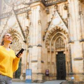 Evita las largas colas de la taquilla y disfruta de una recogida rápida y sencilla de tu entrada Get and Go para el Castillo de Praga, una detallada audioguía de los interiores, un asistente en línea multilingüe y vales de descuento exclusivos para tu visita a Praga. Empieza con una breve introducción en línea y luego explora los interiores del complejo del Castillo de Praga a tu propio ritmo con la audioguía de interiores.