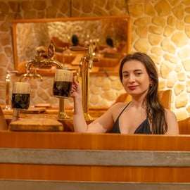 ¡Prepárate para una experiencia inolvidable en Praga! Los checos son mundialmente famosos por su cerveza, y ¿qué mejor forma de sumergirte en su cultura que con un auténtico baño de cerveza? Olvídate de los típicos spas, aquí te espera una inmersión única en un jacuzzi de madera de roble, repleto de un elixir de lúpulo, levadura y hierbas aromáticas, todo ello infusionado con la mejor cerveza negra checa. Imagina la sensación: un baño caliente y relajante, compartiendo este momento especial con tu pareja o amigos, mientras disfrutas de una excelente cerveza. Disponemos de tres bañeras de roble, perfectas para grupos que quieran vivir esta aventura juntos. ¡Reserva tu experiencia y sumérgete en el corazón de la tradición cervecera checa!