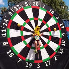 2. Dardos gigantes para los pies: el soltero estará colgado de los dardos para los pies y tú le golpearás con pelotas blandas.