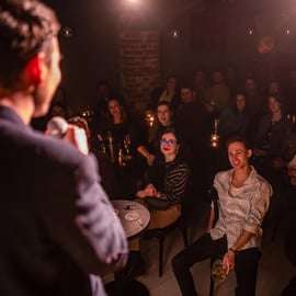 Únete a nosotros en el Metro Comedy Club, el primer y único local de Praga dedicado a la comedia stand-up, situado en el corazón de Praga 1, a pocos pasos del Puente de Carlos. Vive una velada inolvidable llena de risas, con los mejores cómicos de Europa. Nuestros espectáculos reúnen a una variada mezcla de talentos locales e internacionales, que ofrecen perspectivas frescas e hilarantes que seguro que te dejarán con la boca abierta.