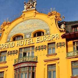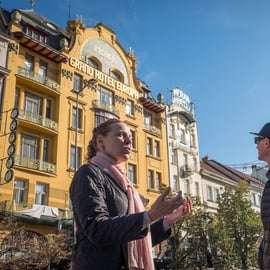 Visitaremos joyas arquitectónicas como el impresionante bar Lucerna y el elegante Grand Hotel Europa. Además, estableceremos interesantes comparaciones con ejemplos de arquitectura cubista y rondocubista, como la Casa de la Virgen Negra y el Banco de las Legiones.